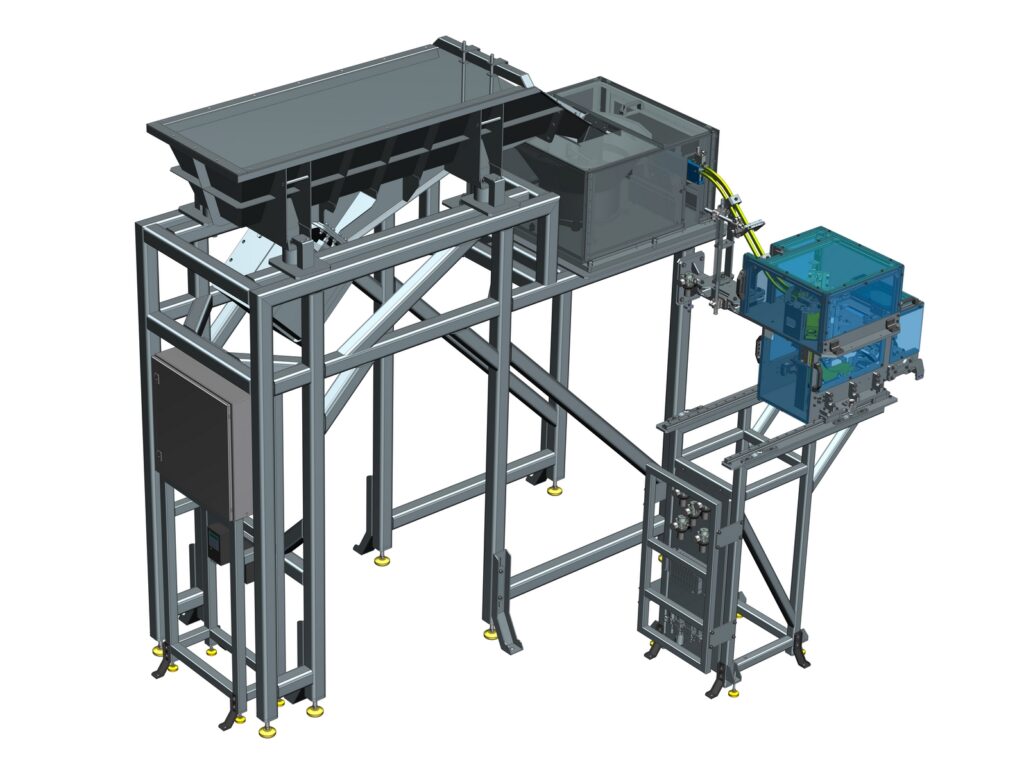 Zařízení slouží k automatickému třídění a zakládání šroubů do brusky Nomoco. Vstupní zásobník zařízení pojme cca 450kg šroubů, které jsou postupně přisypávány do kruhového vibračního podavače. Za podavačem jsou šrouby směrovány do skluzů a ukládány ve dvou drahách řetězového dopravníku, který zásobuje brusku. Zařízení je koncipováno pro bezobslužný provoz. Jednoduchou přestavbou je možné jednoduše přecházet mezi různými typy šroubů.