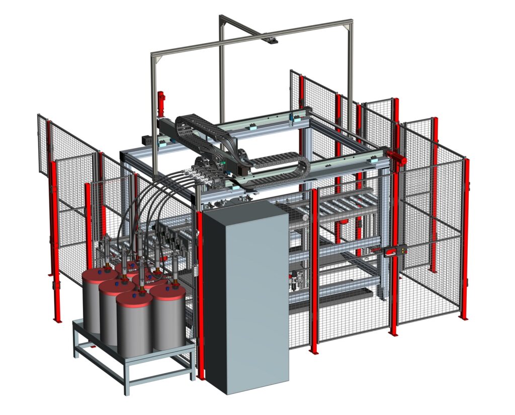 Zařízení slouží k plnění převodovek oleji podle receptury. Na vstupní dopravník najede převodovka umístěná na přepravní paletce, která je vybavena RFID čipem, a dopravník přesune identifikovanou převodovku pod dávkovací hlavu.